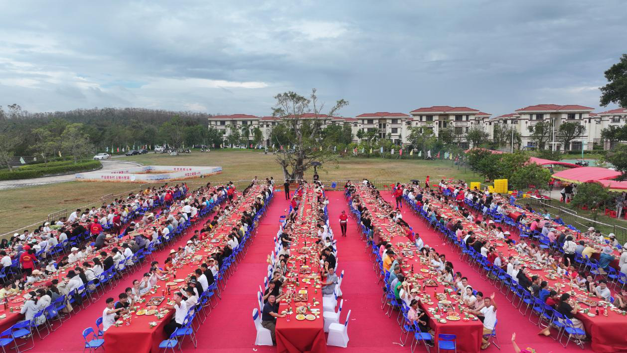 活动尾声,喜庆的歌舞表演拉开千人长桌宴序幕,烤乳猪、大锅煮猪肉、猪骨老火汤等特色佳肴陆续上桌,全村人围坐共品自家养殖的土猪美味,幸福气息扑面而来。