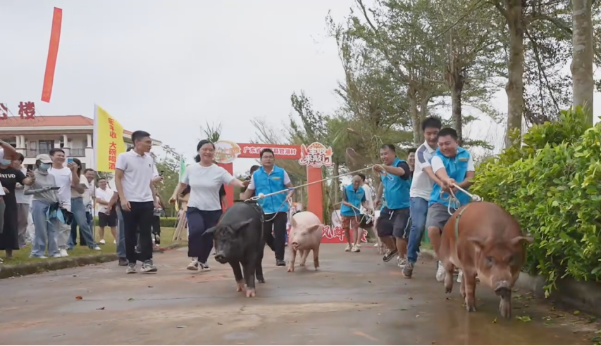 作为丰收节的绝对“主角”,猪猪们让整个村庄沉浸在欢乐海洋。其中,五个品类的土、洋猪种分别被冠以“壹号黑金刚”“法国拜白富美”“粤桂小花花”“丹麦大长腿”“美国金毛哥”的美名,搭档各自饲养员开启的50米短跑竞赛,直接引爆现场。